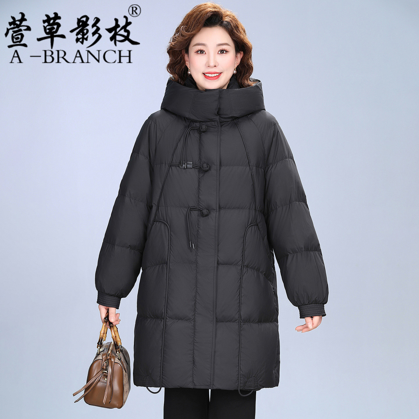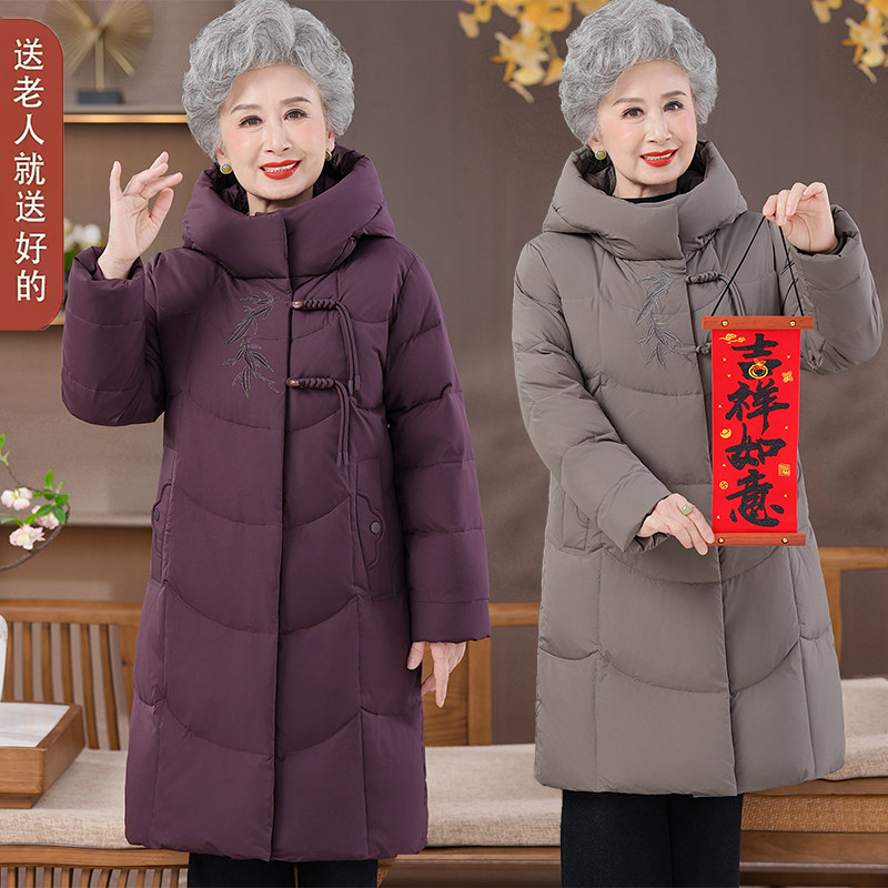 中老年妈妈羽绒服女复古盘扣加厚连帽白鸭绒中长款奶奶装保暖外套