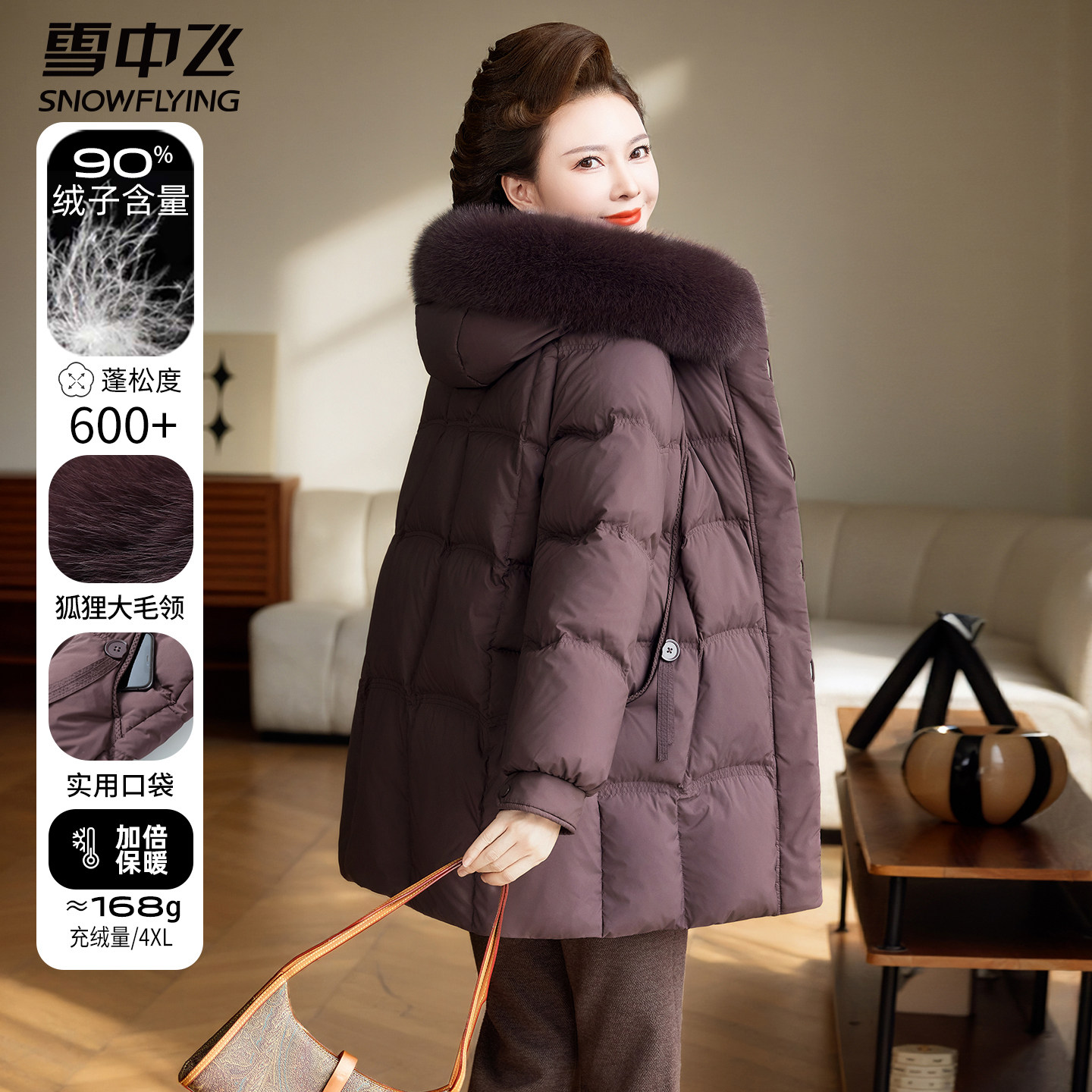 雪中飞中长款中年2025新款冬装连帽女款冬季中老年妈妈羽绒服外套