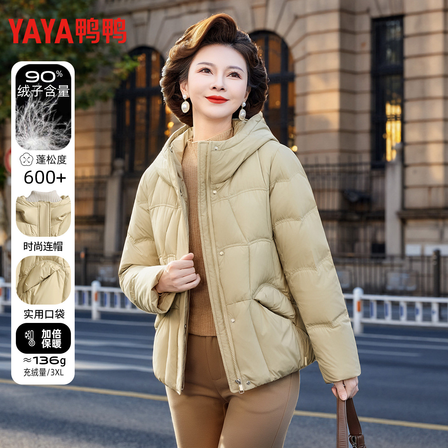鸭鸭中老年妈妈羽绒服女冬连帽90绒实用口袋短款正品保暖羽绒外套