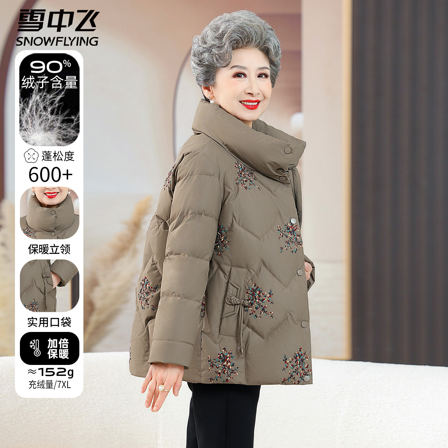 雪中飞中老年妈妈羽绒服短款立领冬装新款小个子奶奶刺绣保暖外套