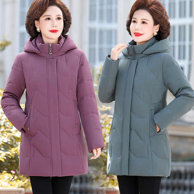 中老年妈妈羽绒服外套冬中长款连帽2025新款羽绒袄55岁女保暖休闲