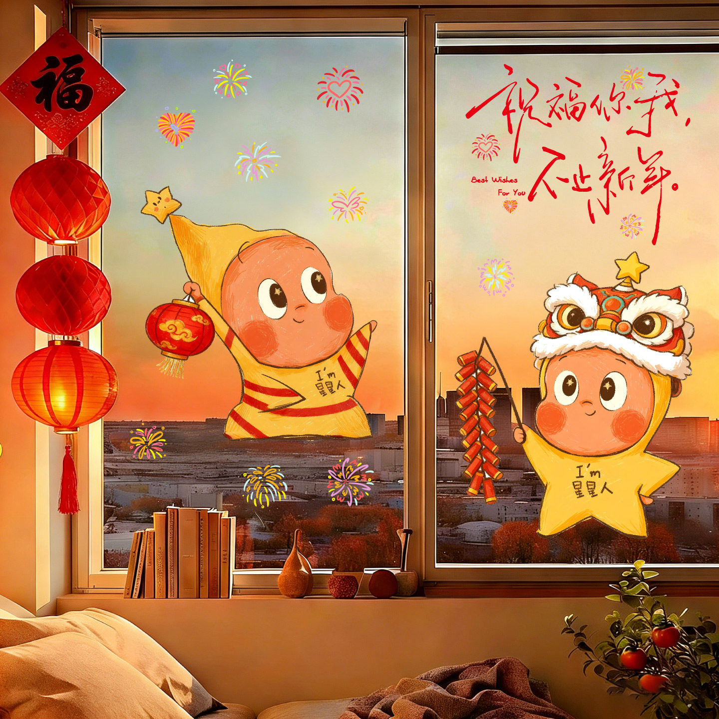 马年大吉家居装饰玻璃贴纸新年快乐烟花喜庆窗花贴2026春节静电贴