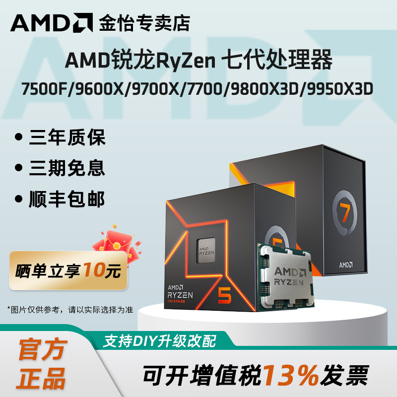 AMD锐龙7500F/9600X/9800X3D/9950X3D全新AM5CPU散盒处理器