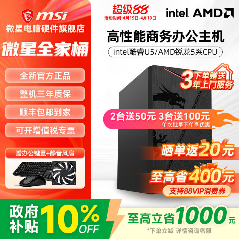 微星办公电脑主机AMD 5600GT/5700G/Ultra 5 225核显家用网课游戏平面设计炒股商用DIY台式电脑全套组装整机