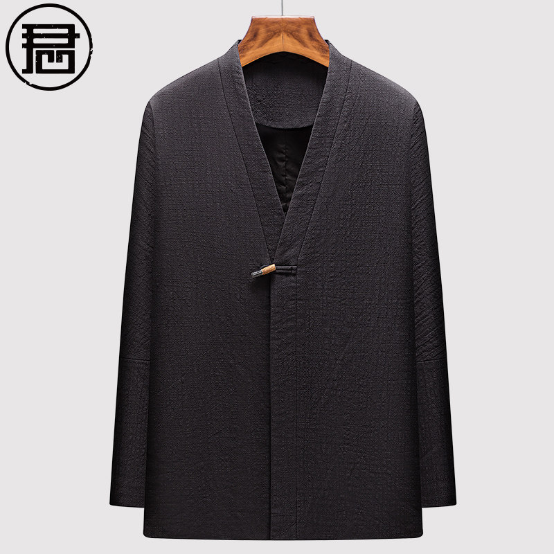 纯棉中式风衣男春装外套青年佛系禅意V领复古中长款国风男装上衣