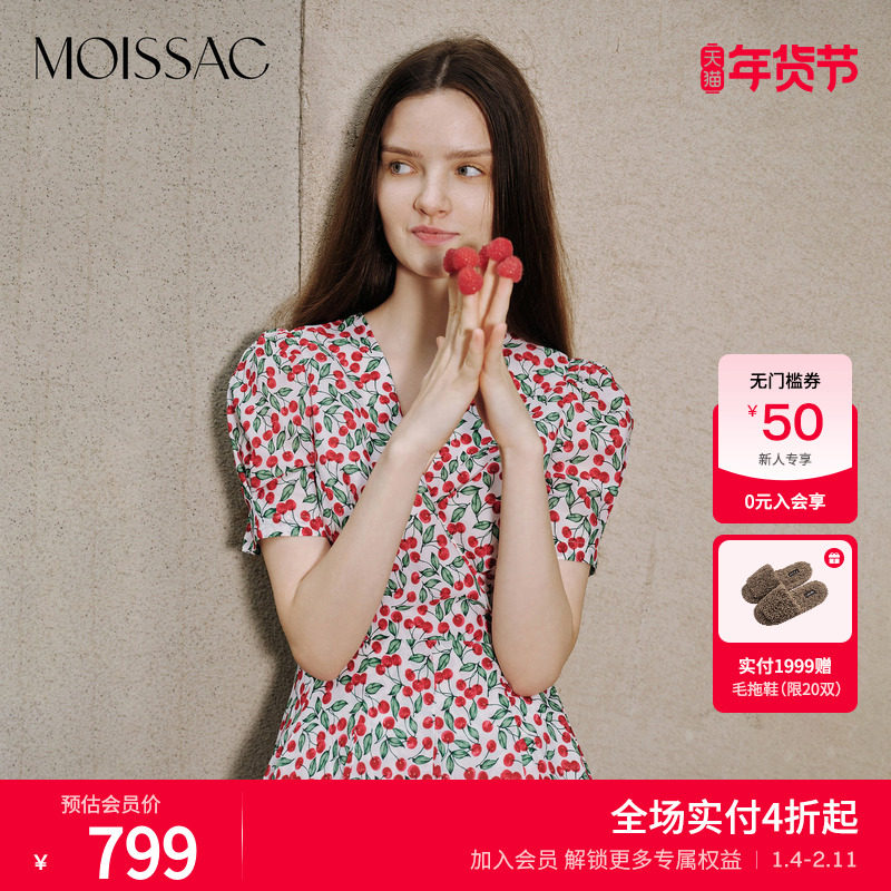 菲梦伊印花亮片连衣裙女春装新款复古高腰显瘦V领修身中长款裙子