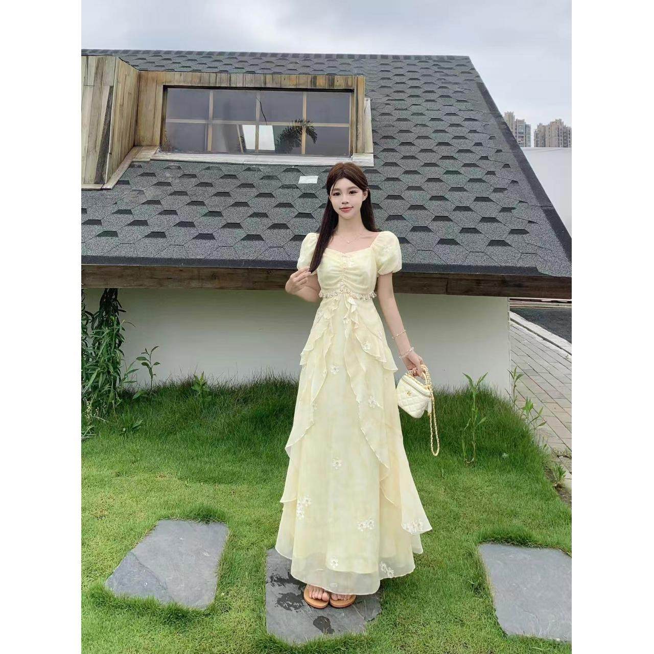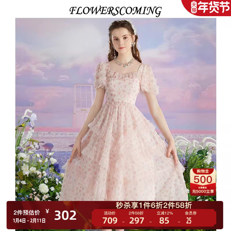 花儿开了2025夏季新款法式超仙网纱印花连衣裙女高腰设计感公主裙