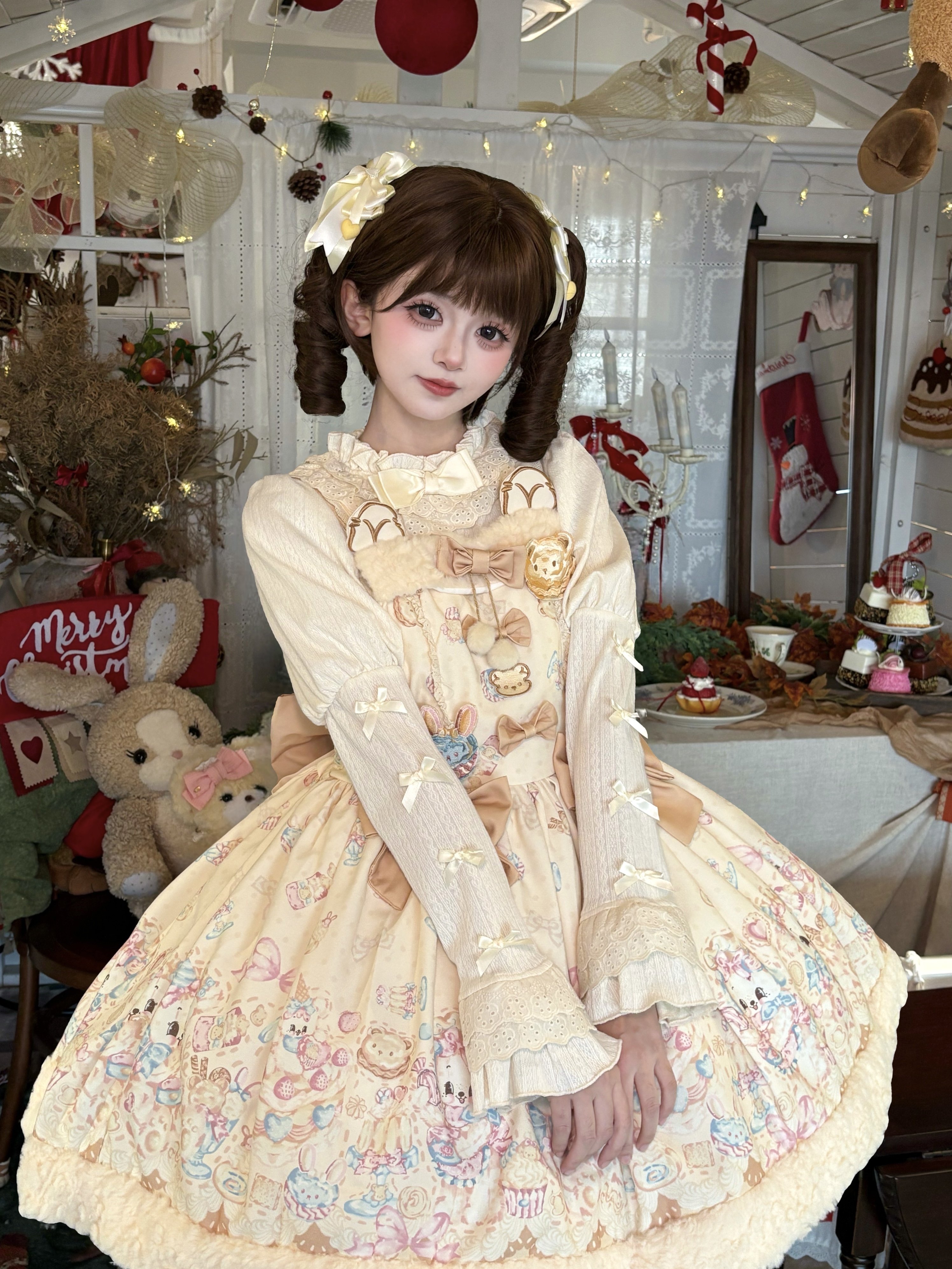 绒兔气泡糕原创 小熊点心 高腰背带小熊印花甜美Lolita设计连衣裙