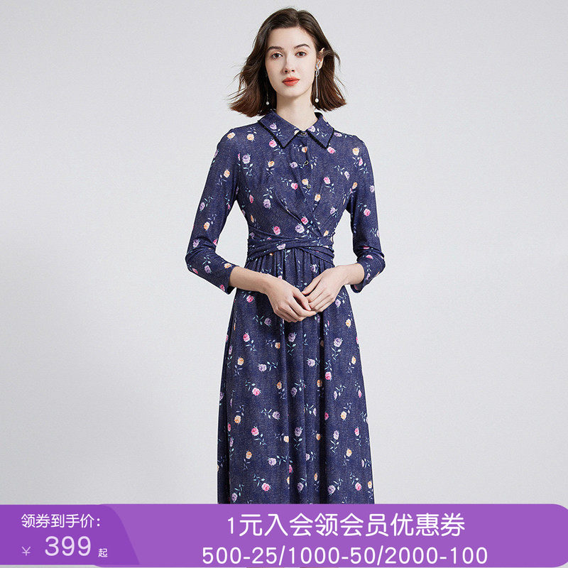 沐兰法式优雅印花连衣裙2025年冬季新款高腰修身印花气质衬衫裙