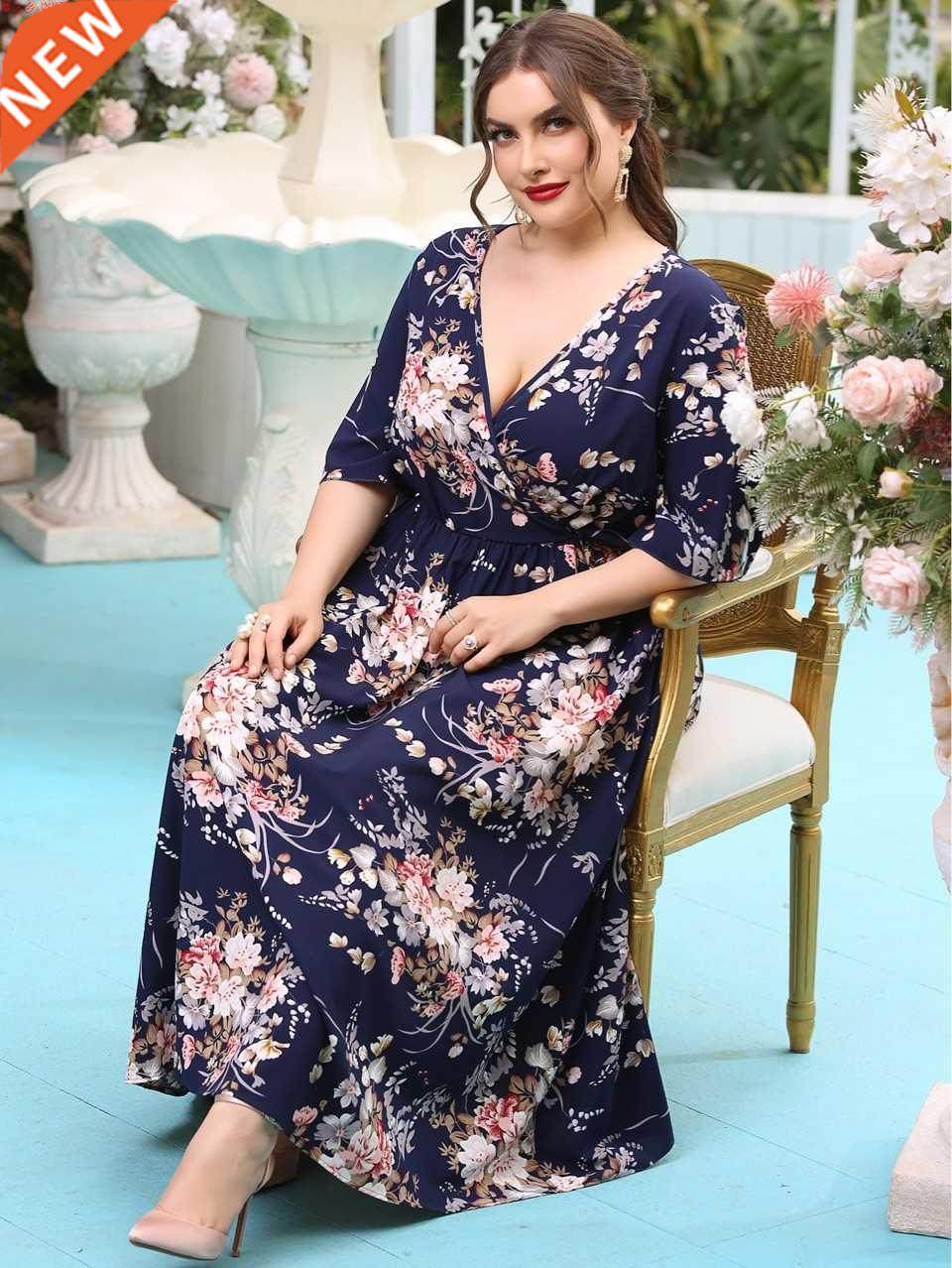 L-4XL大码胖MM女士印花高腰连衣裙Large print lady dress2023