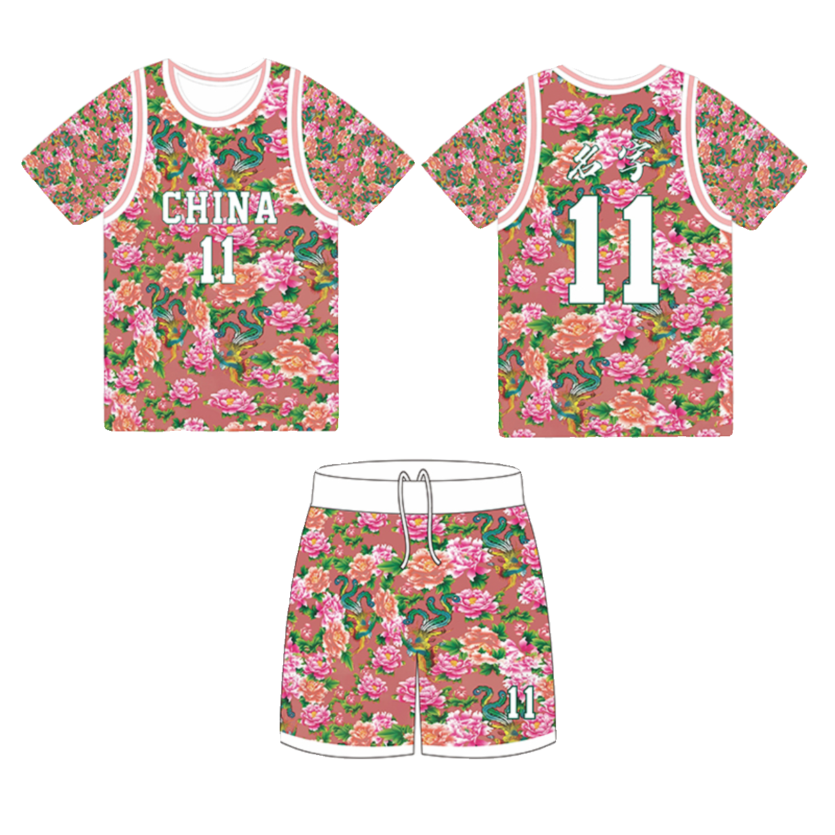新款篮球服定制东北大花袄短袖球衣假两件套装比赛队服儿童表演服