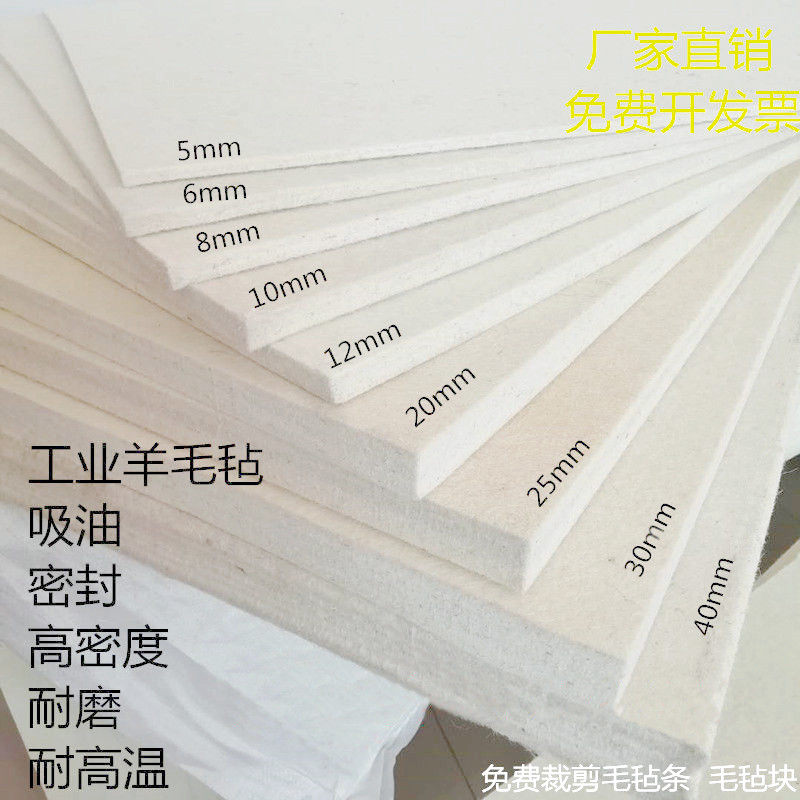 工业羊毛毡吸油高密度耐磨耐高温防震防尘抛光毛毡条块圈1-50mm厚