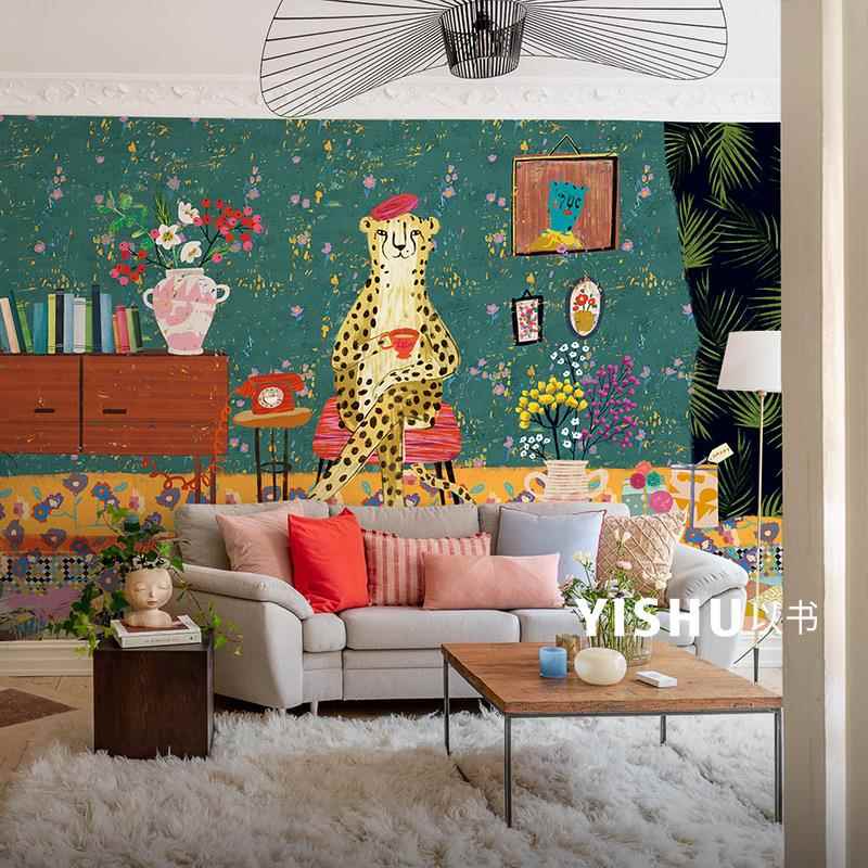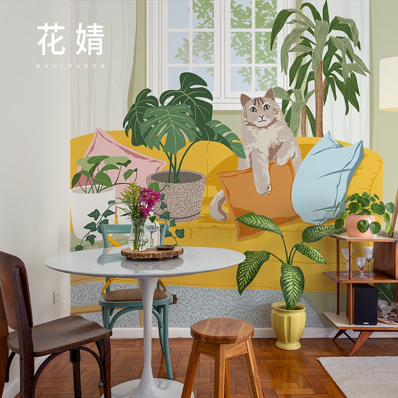 手绘猫咪植物墙布现代创意客厅背景墙艺术壁纸卧室儿童房定制壁布