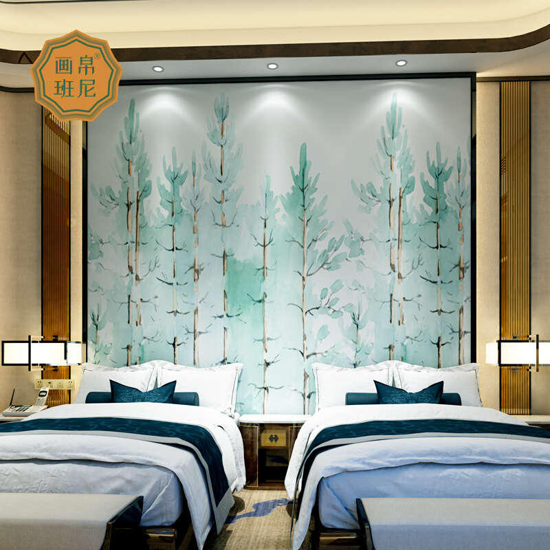 日式电视墙壁画定制沙发卧室餐厅背景墙艺术壁纸墙画手绘翠绿树林