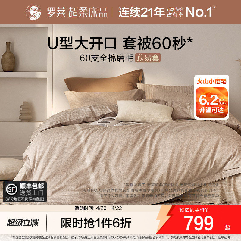 罗莱家纺U易套全棉磨毛加厚四件套纯棉60支超柔懒人易套被套件
