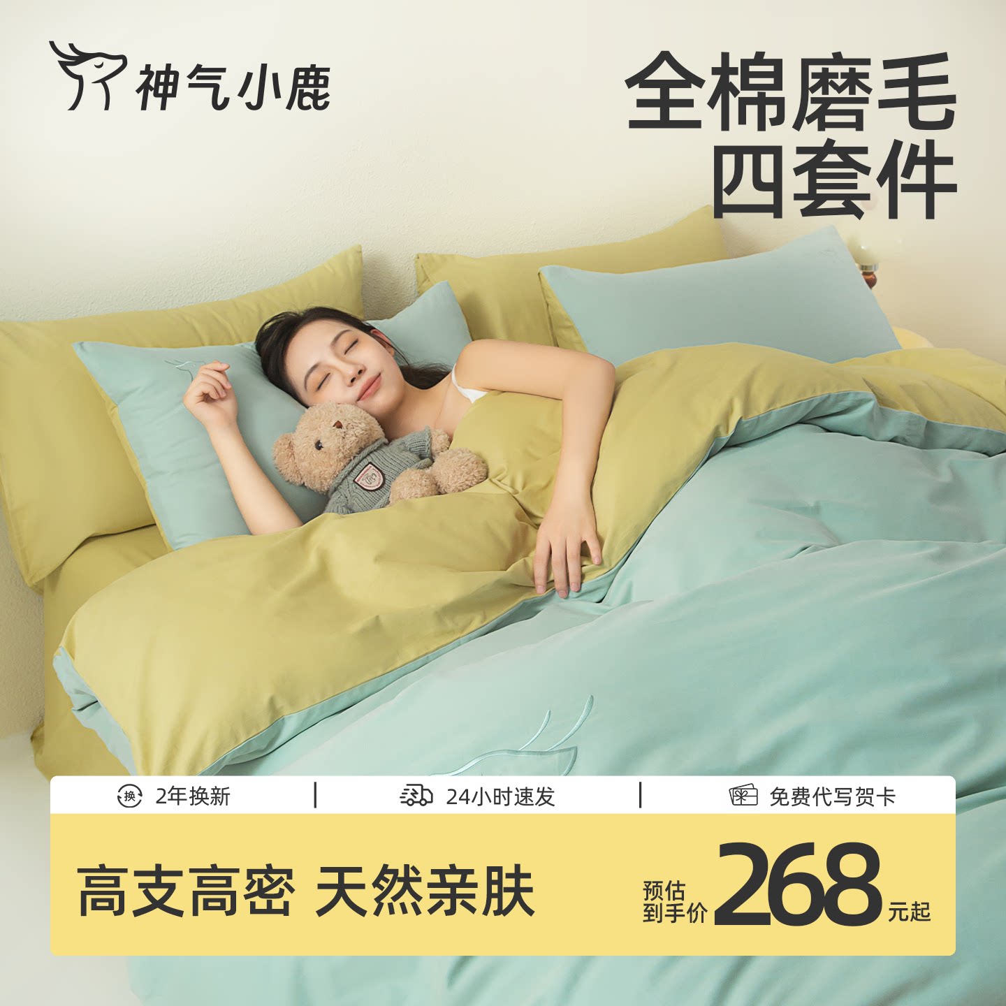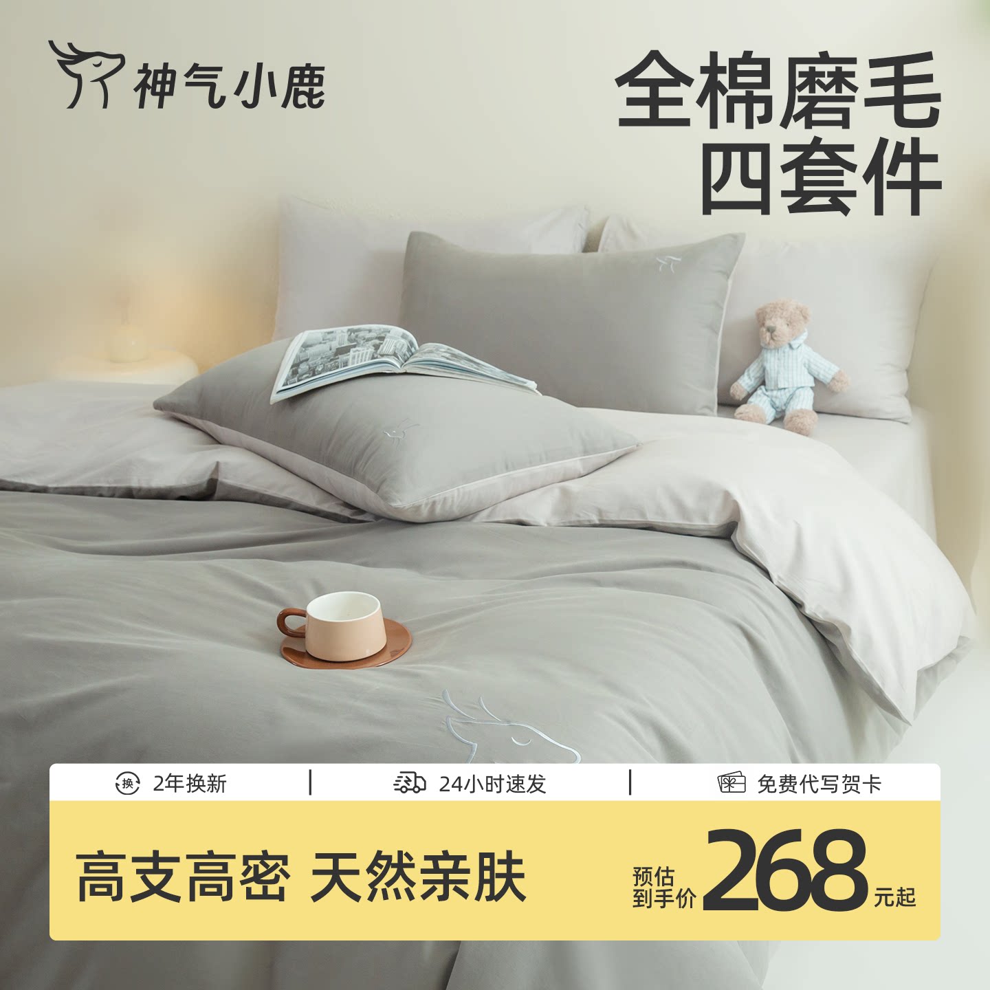 神气小鹿100%新疆长绒棉60支磨毛四件套裸睡A类抑菌简约被套床单