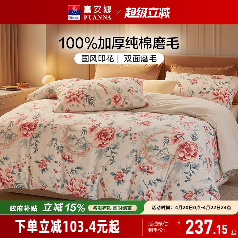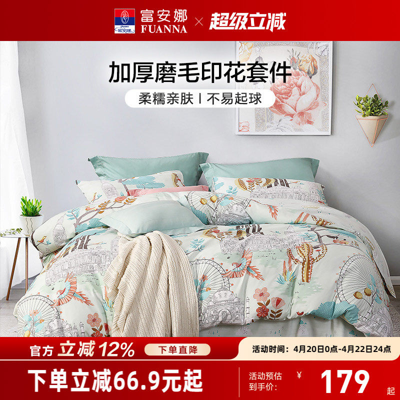 富安娜纯棉磨毛加厚四件套60支长绒棉套件全棉保暖被套春秋季产品