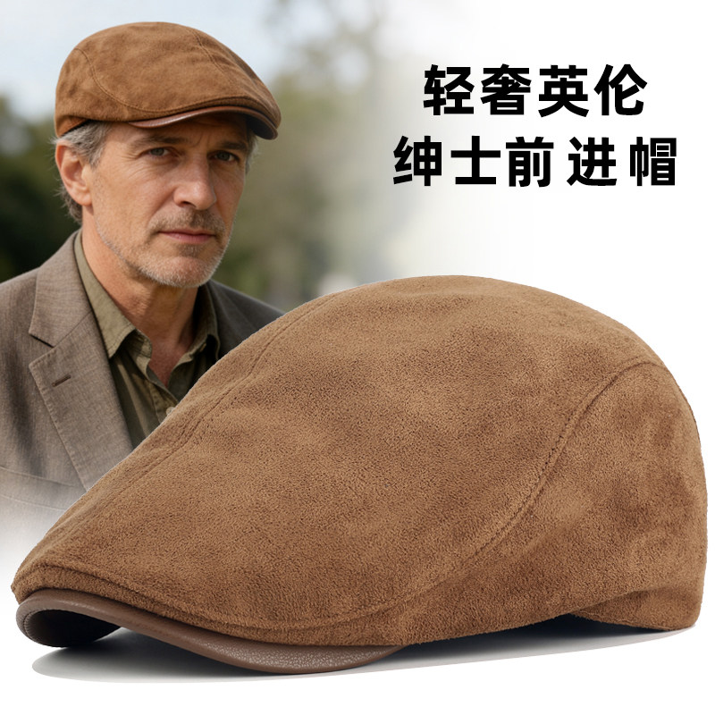 高端复古前进帽男士2025新款休闲贝雷帽子英伦鹿皮中老年鸭舌帽冬