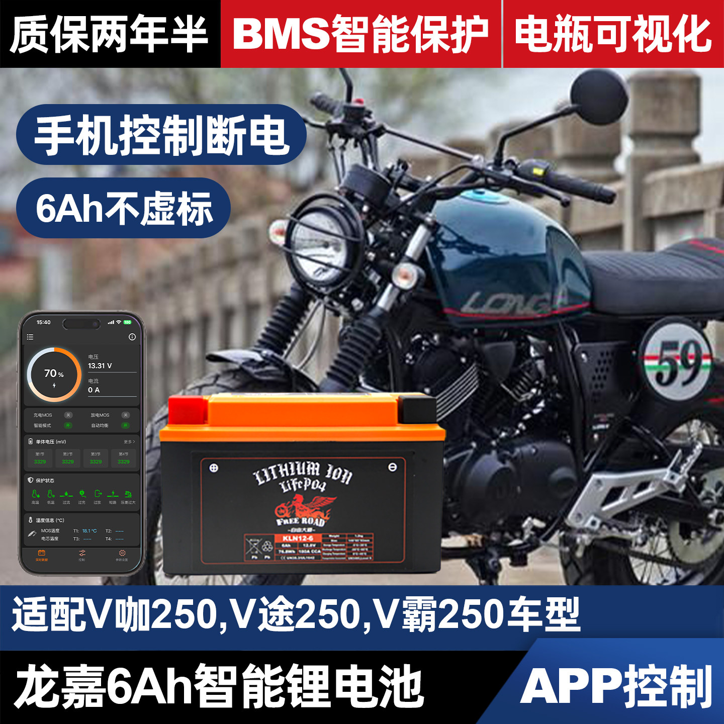 自由大道适用于龙嘉摩托车12V锂电瓶 V咖V途V霸250智能一键断电