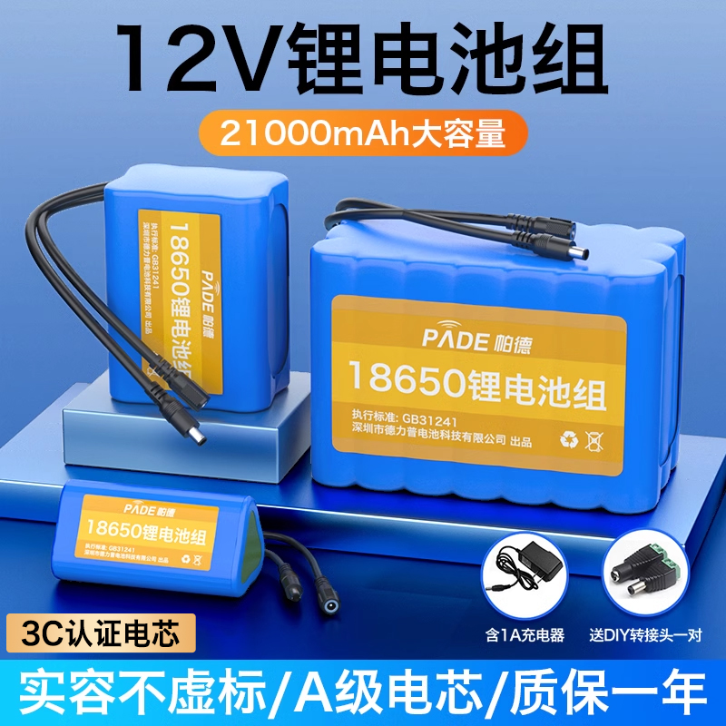 帕德12v锂电池组18650大容量户外照明灯移动电源音响24伏可充电瓶