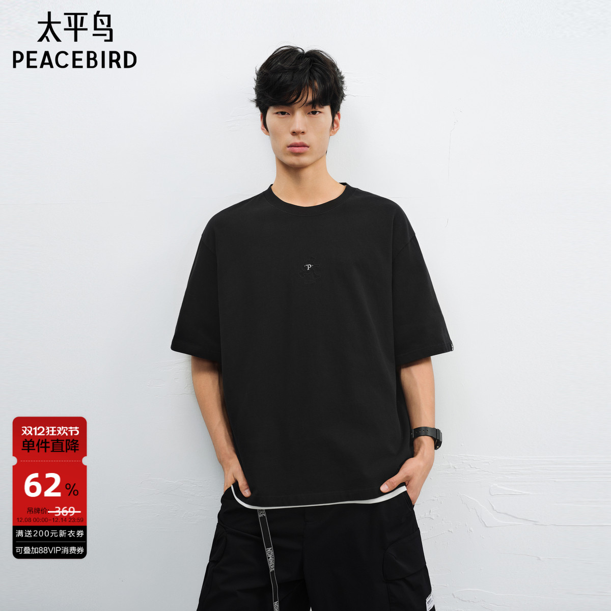 【T恤热卖清仓】太平鸟男装重磅刺绣短袖t恤休闲体恤衫纯色半袖潮