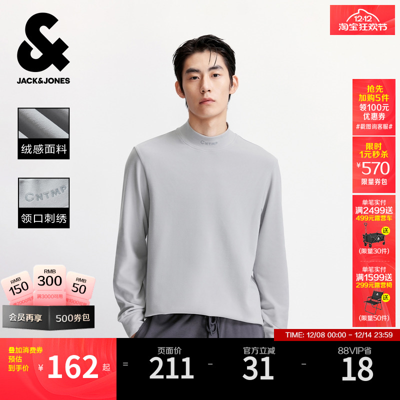 【半高领T恤】杰克琼斯男装秋季新款绒感长袖打底衫刺绣纯色上衣