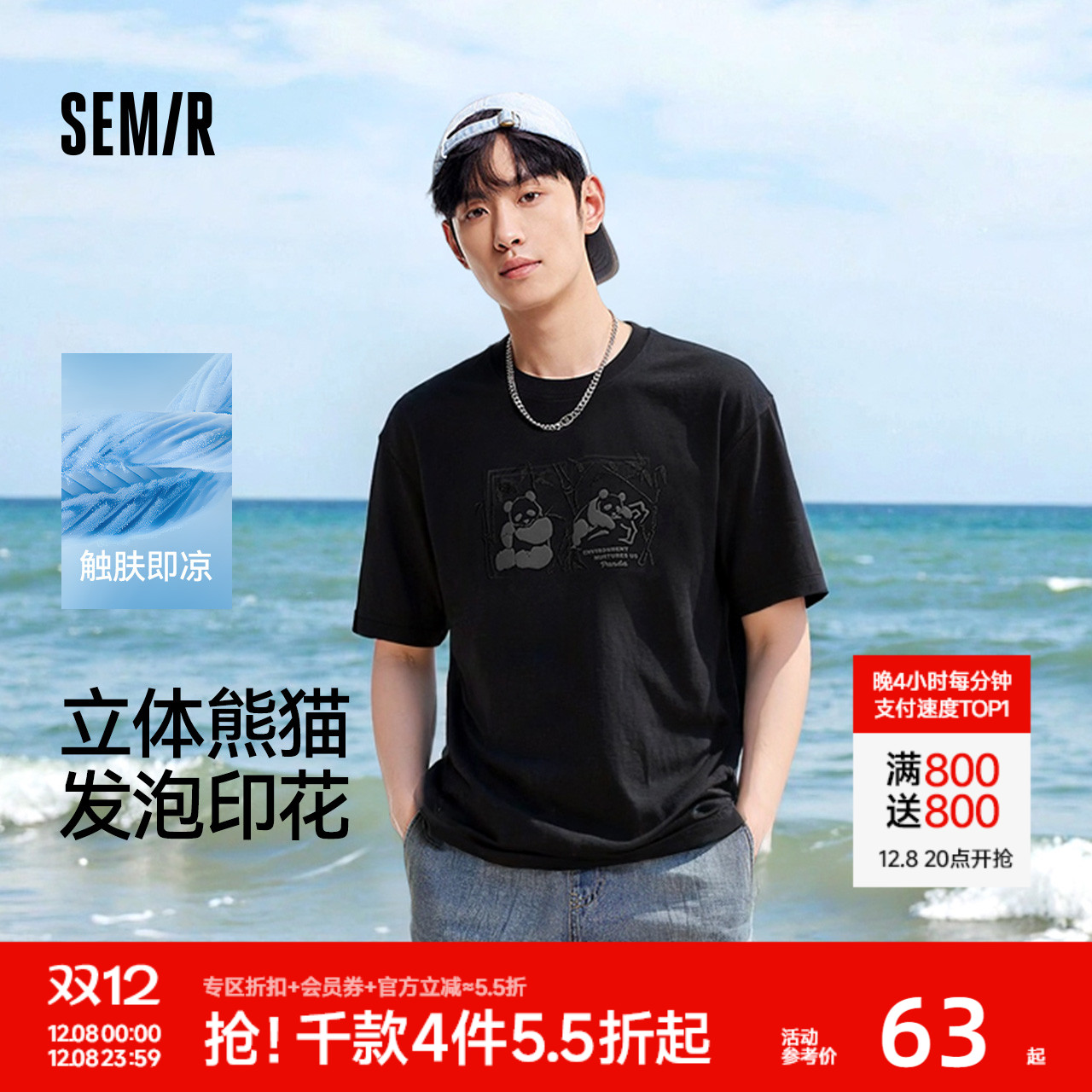 凉感森马短袖T恤男装25夏季新款熊猫国风印花刺绣宽松新中式上衣