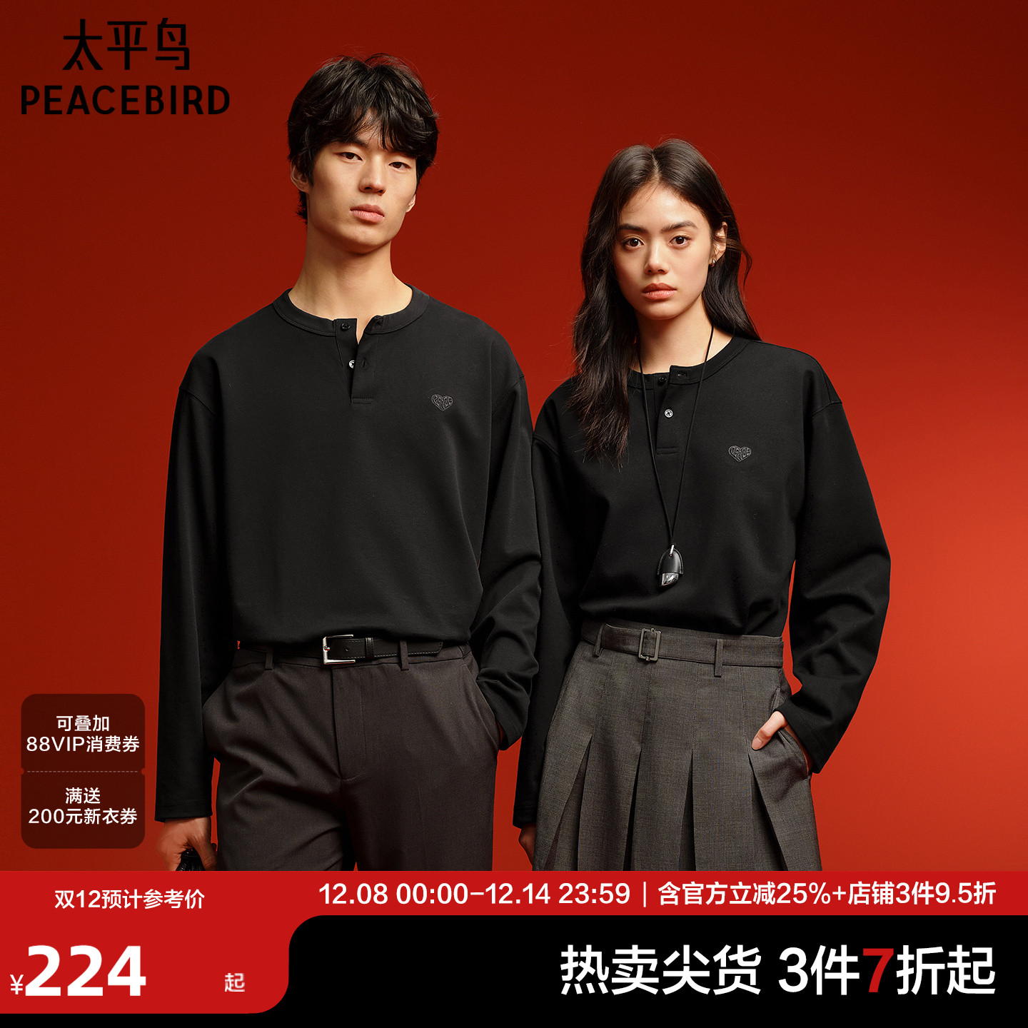 【亨利领】太平鸟男装重磅刺绣长袖T恤春新款纯色打底衫宽松内搭