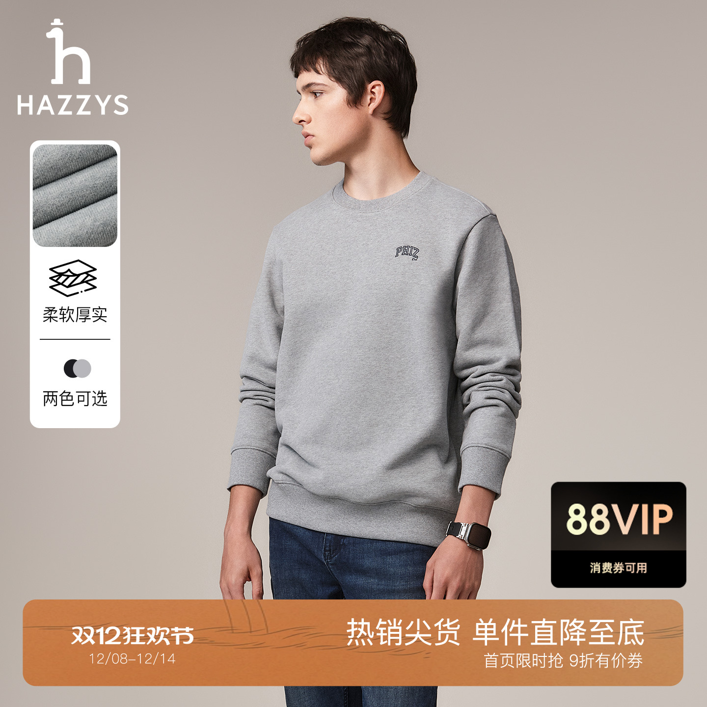 Hazzys哈吉斯秋季休闲圆领卫衣男装通勤纯棉绣花宽松T恤潮流上衣