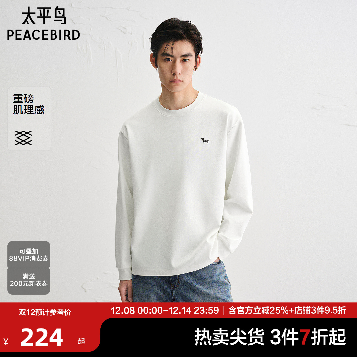 太平鸟男装T恤25秋季新款纯色重磅小狗刺绣长袖宽松肌理打底衫潮