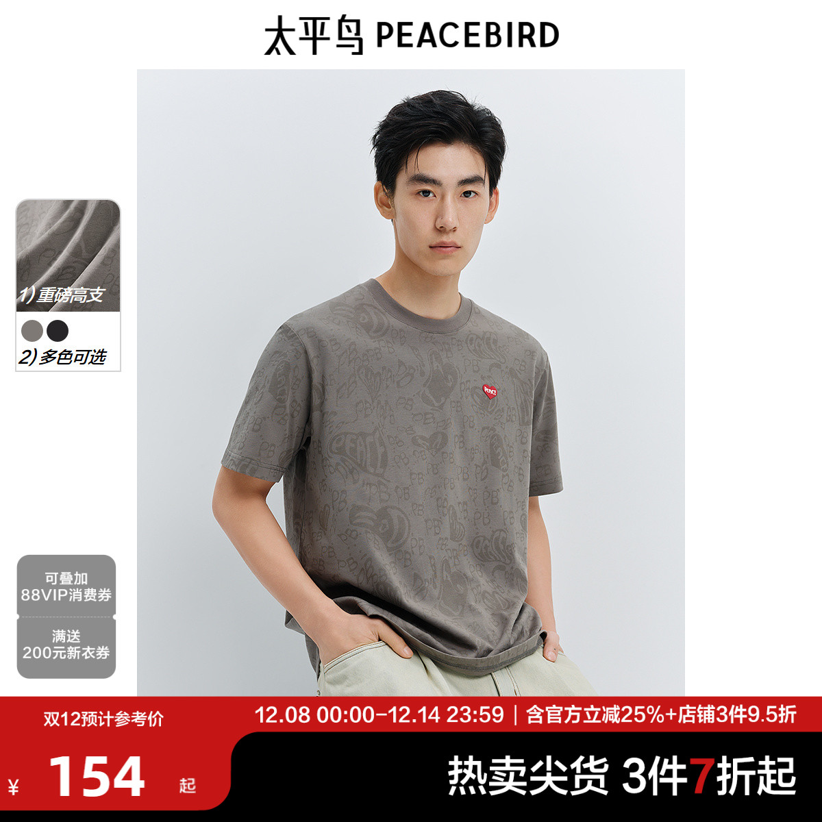 【重磅】太平鸟男装圆领满印T恤2025春新款刺绣短袖体恤时尚上衣