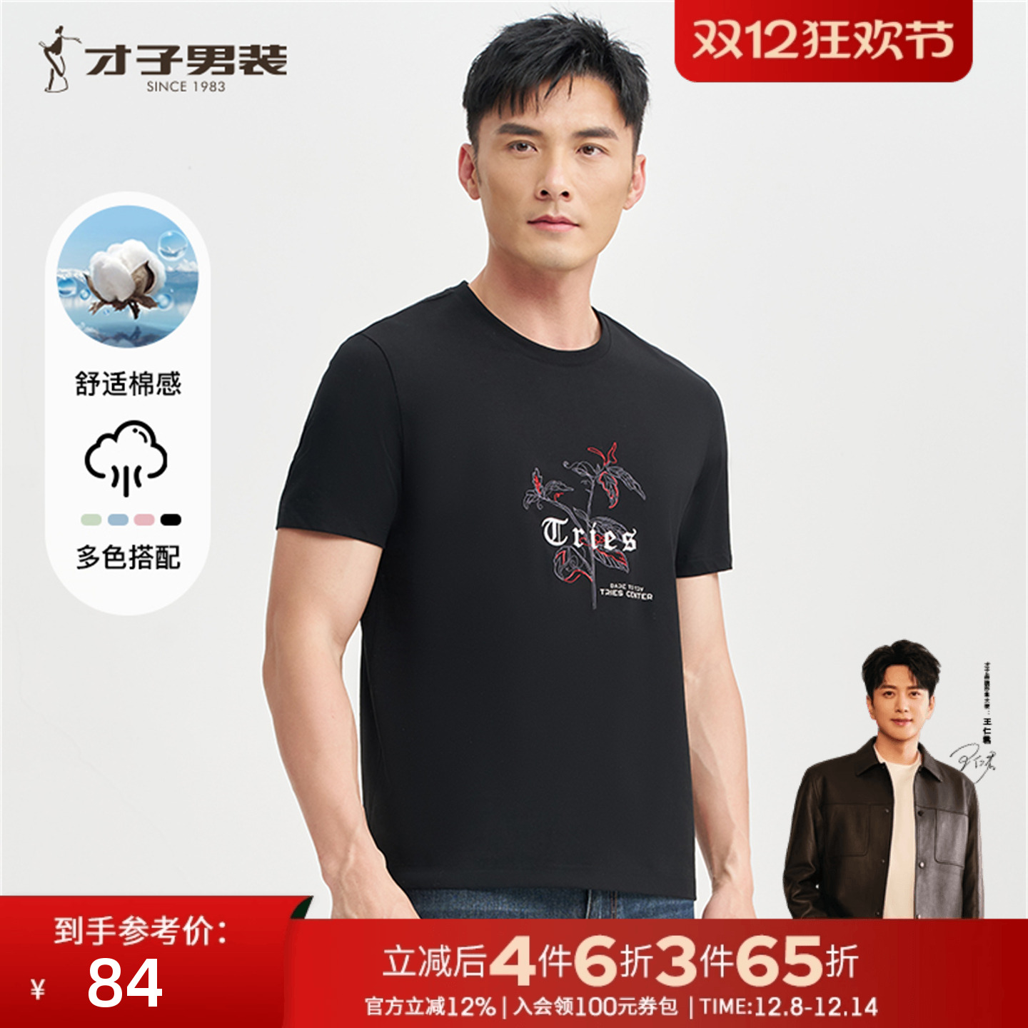 才子男装黑色短袖T恤男士2025夏季新款透气刺绣圆领休闲半袖体恤
