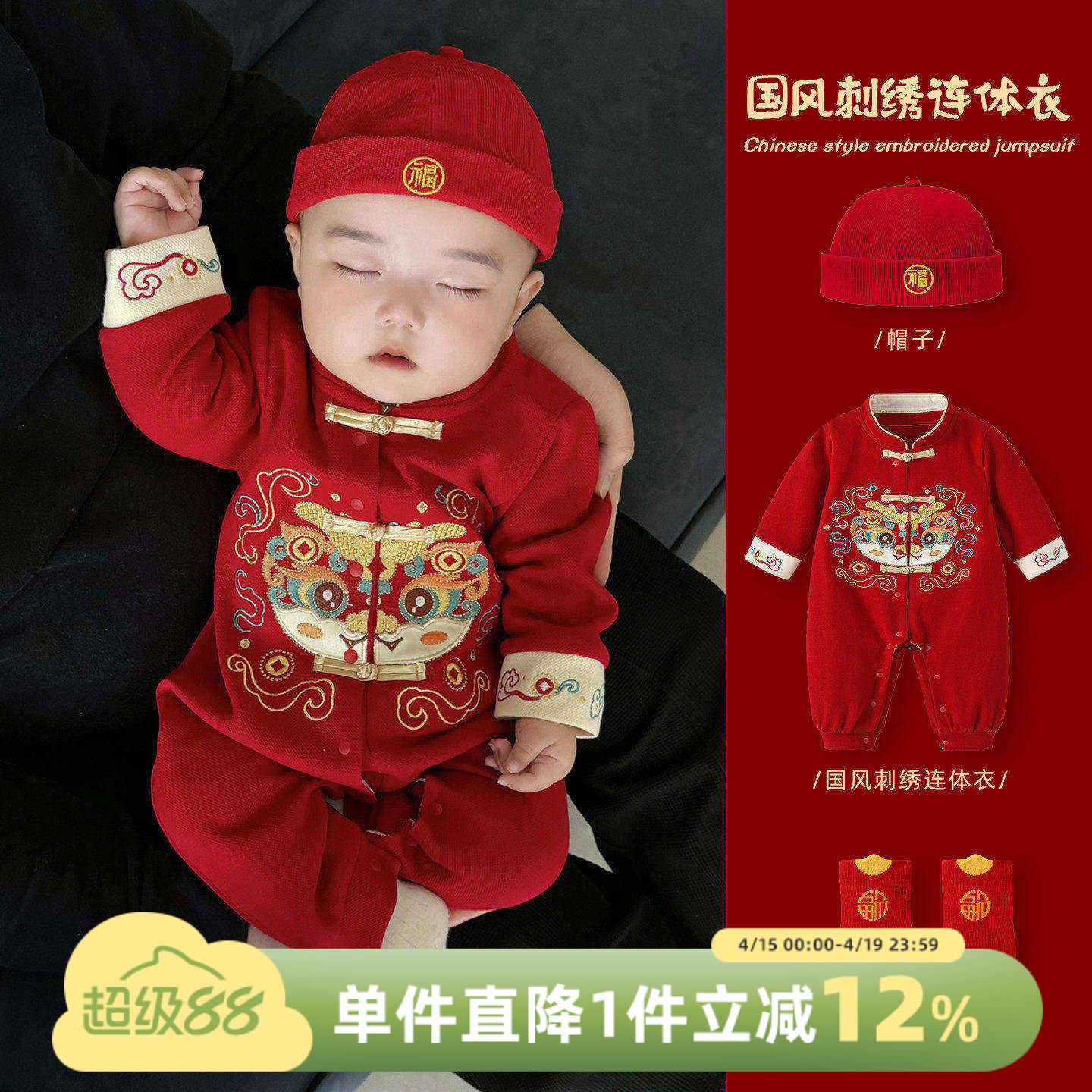 百日宴宝宝服装红色新中式婴儿衣服薄款拜年服生日礼服唐装连体服