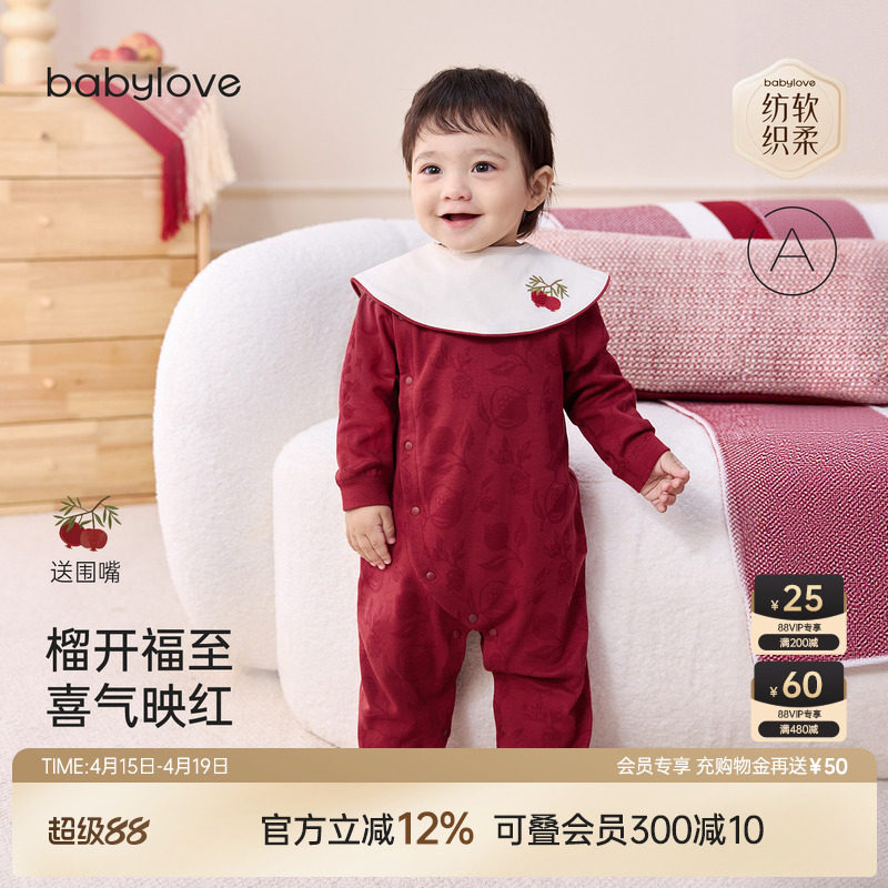 babylove【安心柔】婴儿连体衣宝宝纯棉红色周岁哈衣爬服带围嘴