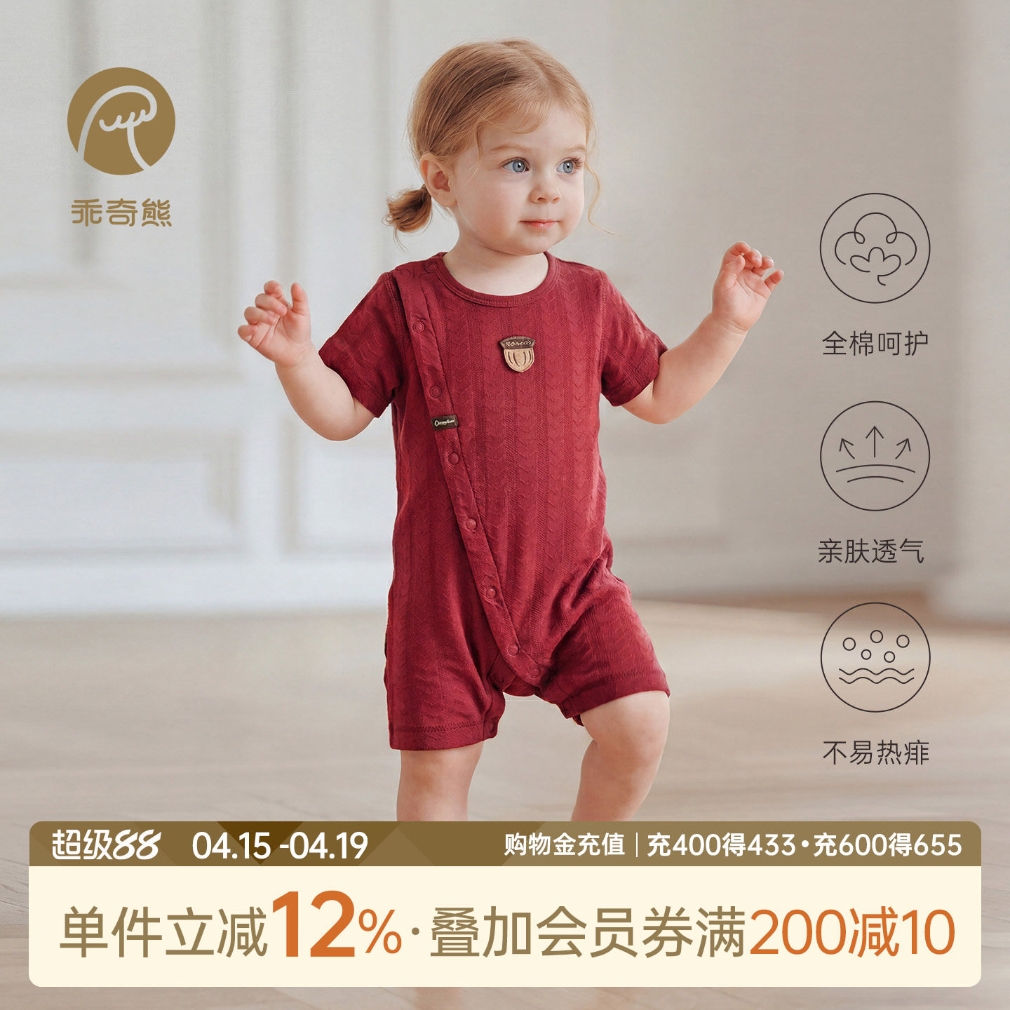乖奇熊宝宝纯棉连体衣夏季薄款红色满月衣服婴儿短袖哈衣爬服周岁