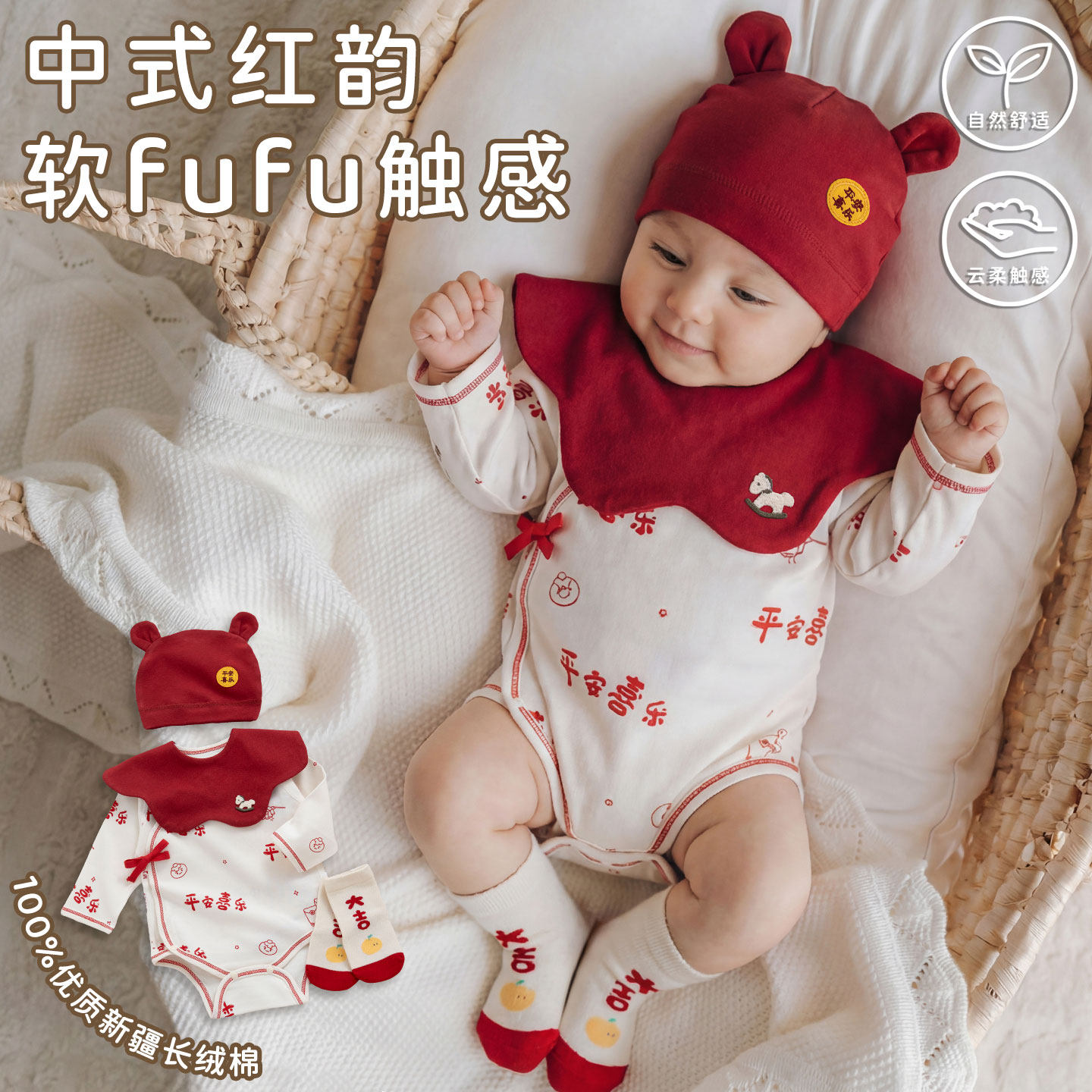 babylove【安心柔】新生儿包屁衣宝宝红色满月纯棉三角哈衣带围嘴