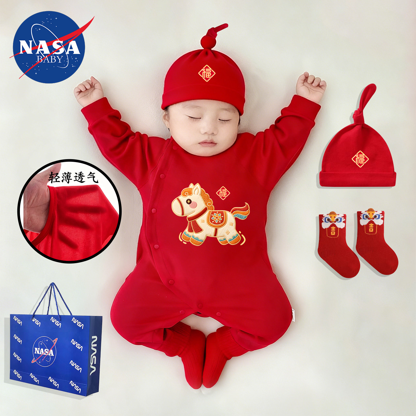 新生婴儿初春小月龄包屁衣男女马宝宝满月百天套装红色喜庆连体衣