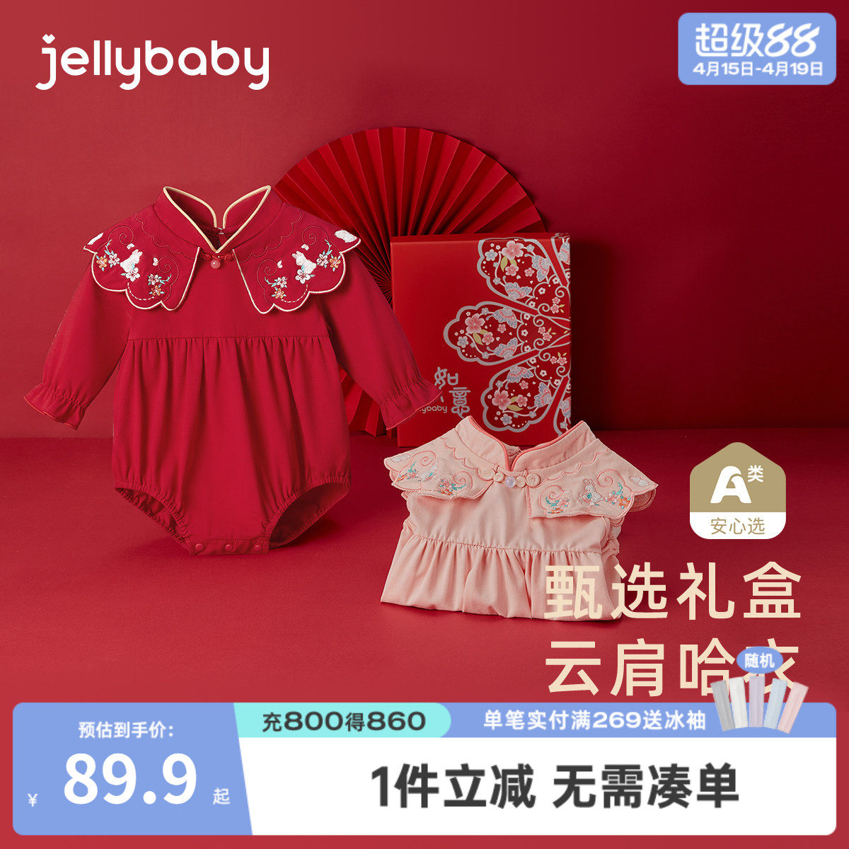 [抗菌礼盒]满月包屁衣新生女婴儿红色连体衣周岁爬服宝宝三角哈衣