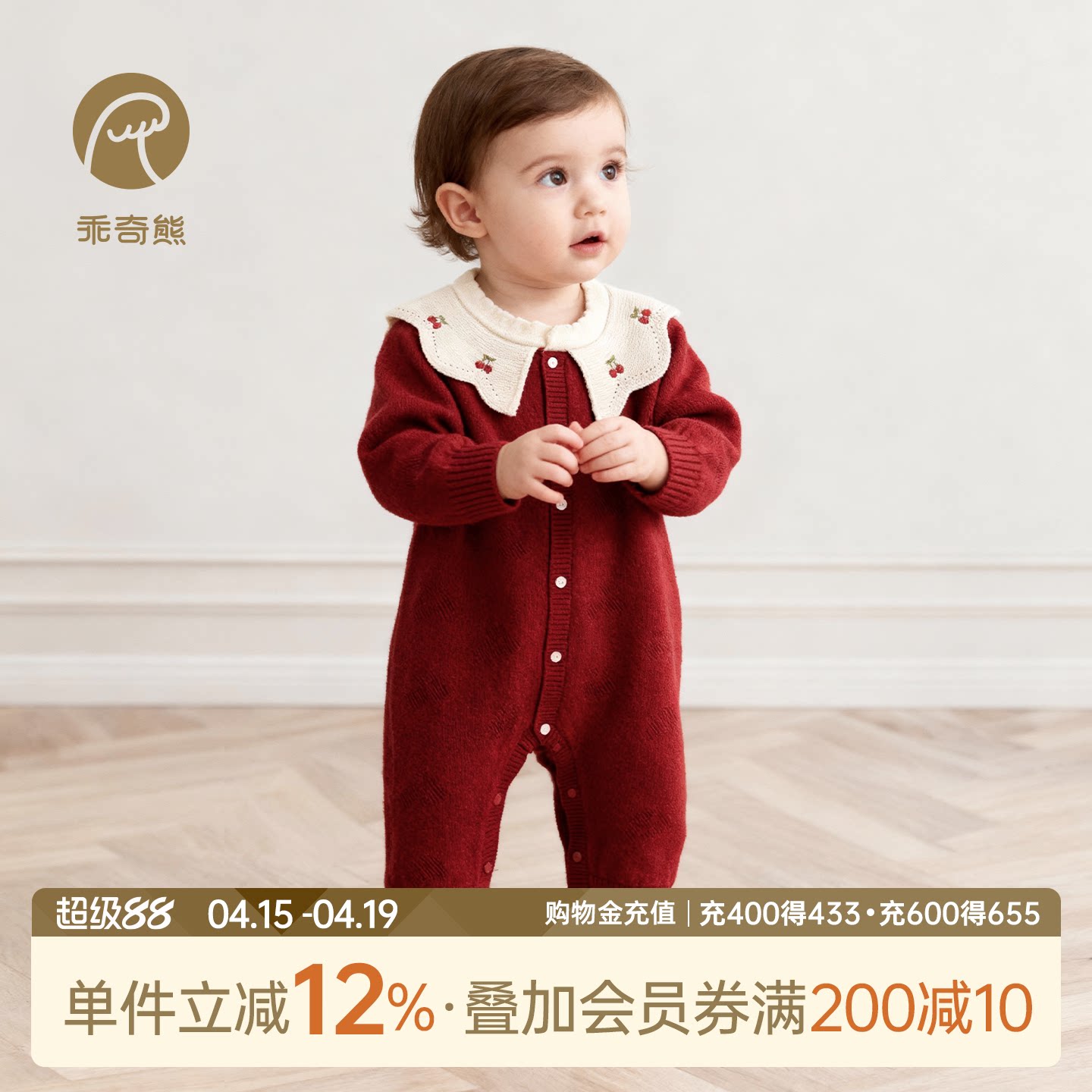 乖奇熊女宝宝针织保暖连体哈衣冬季婴儿童绵羊毛保暖红色周岁礼服