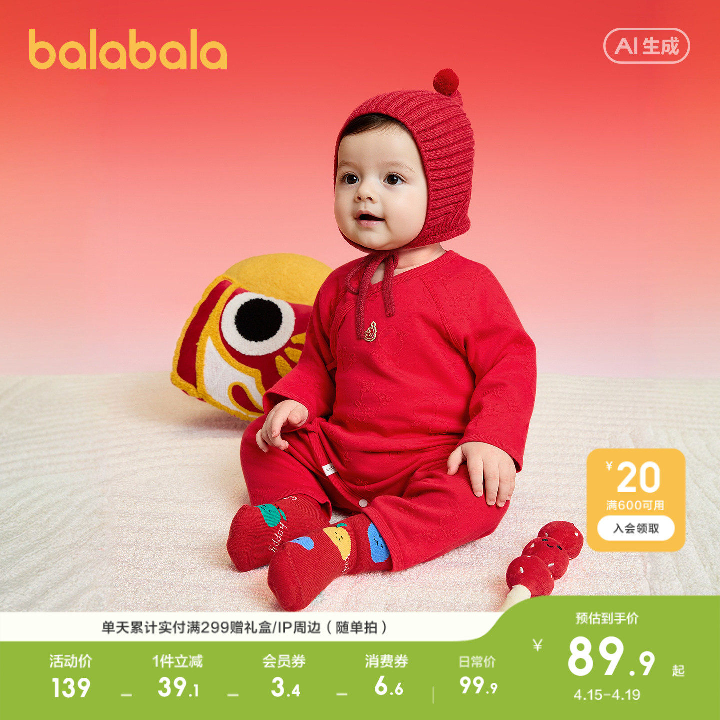 【商场同款】巴拉巴拉新生婴儿连体衣宝宝爬服2026新春红色拜年服