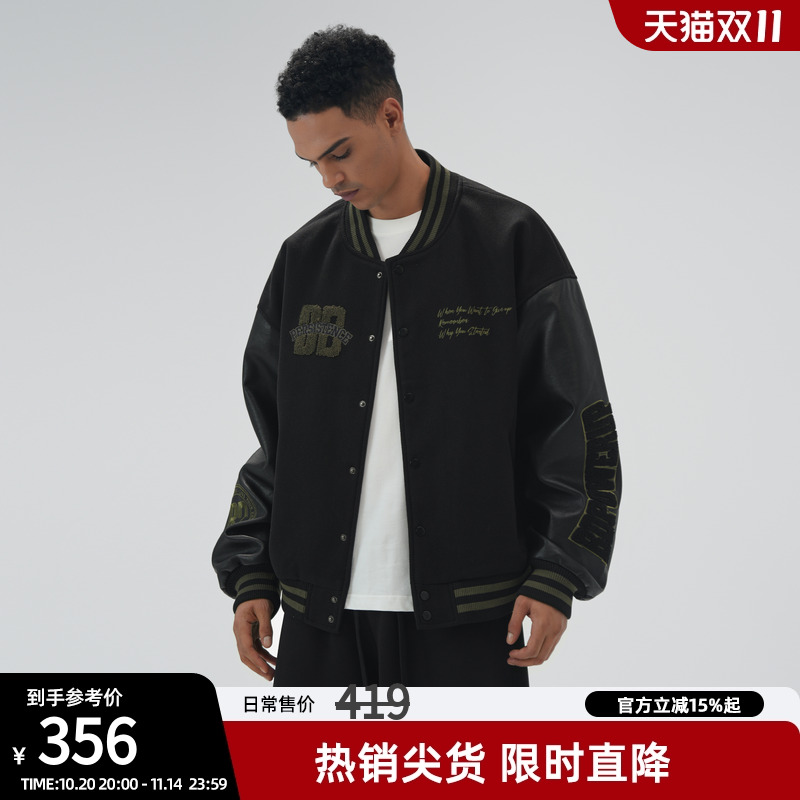 bdpowerup美式毛呢棒球服外套男秋冬季宽松休闲黑色夹克外套
