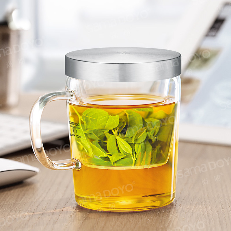 尚明玻璃茶杯花茶杯过滤 办公室泡茶杯 家用透明带盖带把绿茶杯子