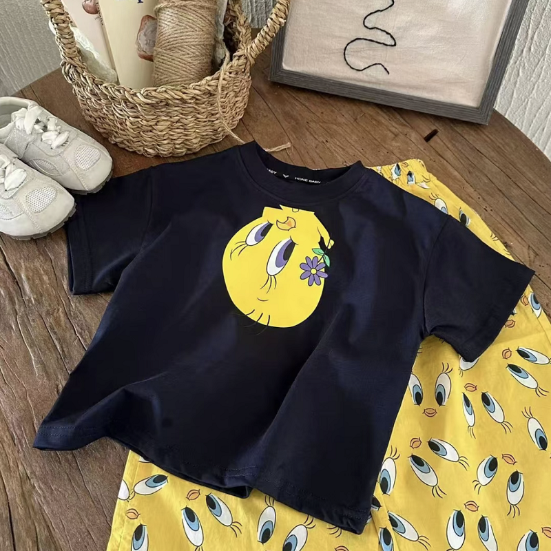 夏季男女童两件套装韩系卡通印花纯棉短袖儿童休闲可爱满印防蚊裤