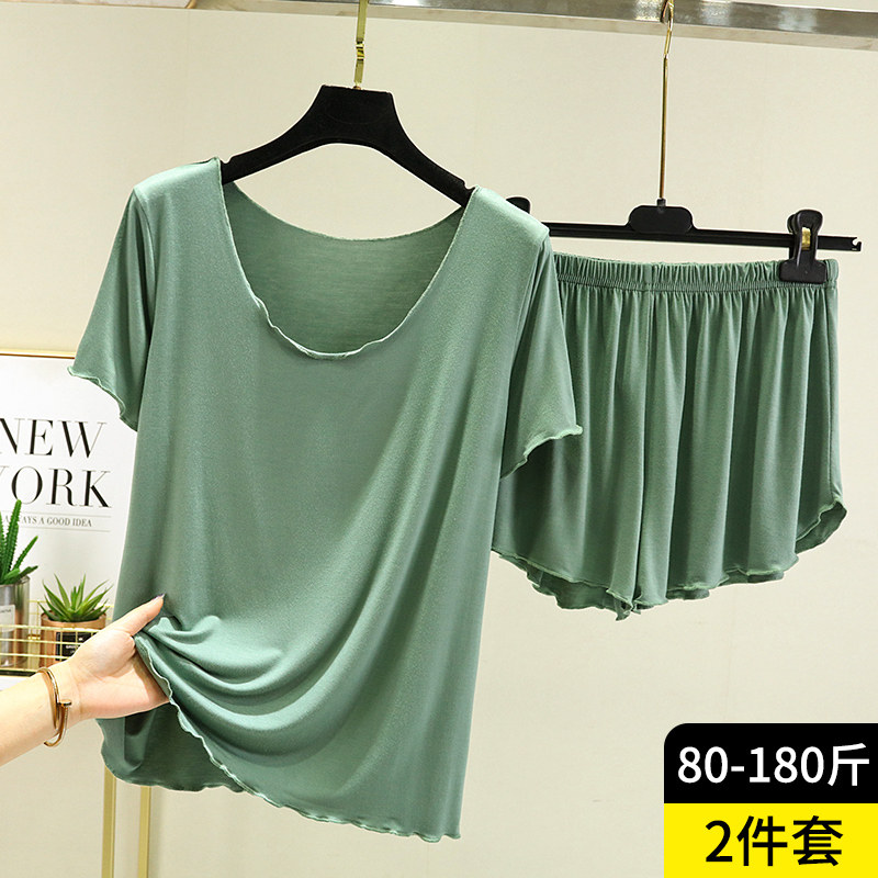 莫代尔套头短袖T恤睡衣睡裤两件套女夏季大码休闲家居服短裤套装