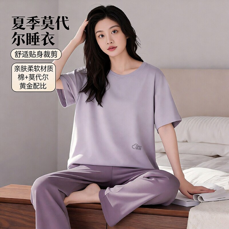 莫代尔女睡衣家居服套装夏季短袖T恤长裤大码两件套居家休闲棉质