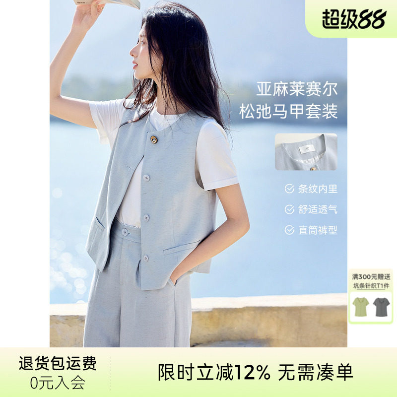 MavenLin 老钱风高端亚麻V领西装马甲套装女夏季休闲阔腿裤两件套