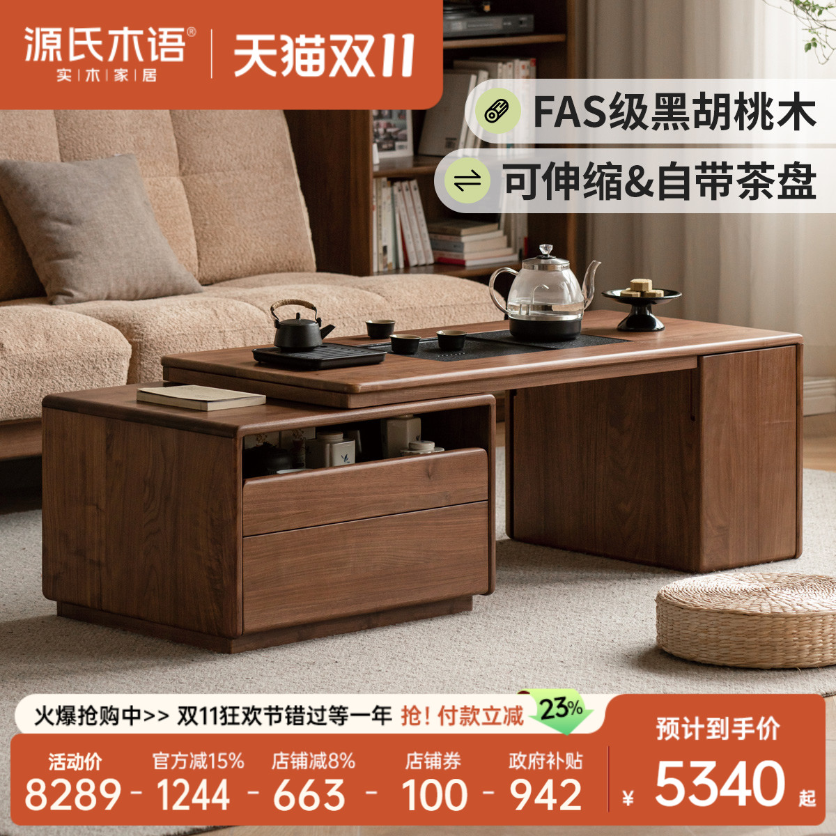 源氏木语实木伸缩茶几现代简约黑胡桃木茶台客厅功夫茶几茶桌组合