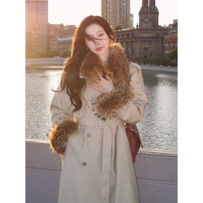 春夏高级感大衣高端轻奢中长款米白色毛领厚外套女装2025新款