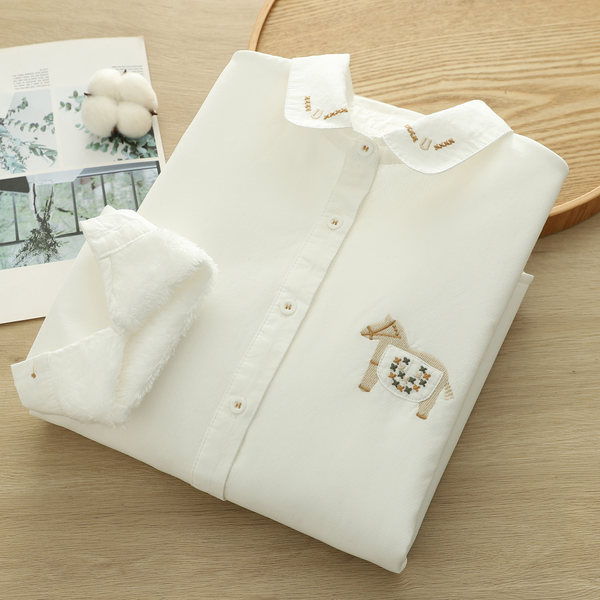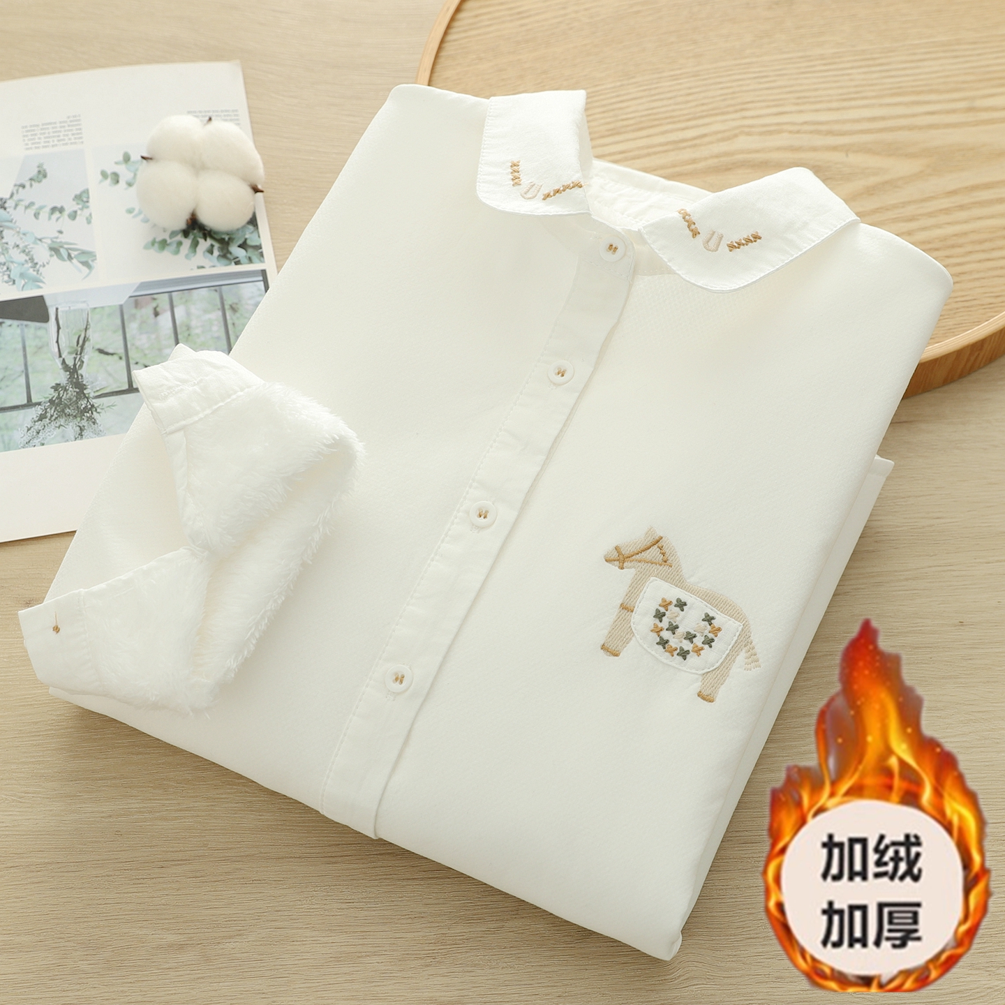 2025冬季文艺小清新卡通刺绣小马纯棉加绒加厚白衬衫女长袖打底衫