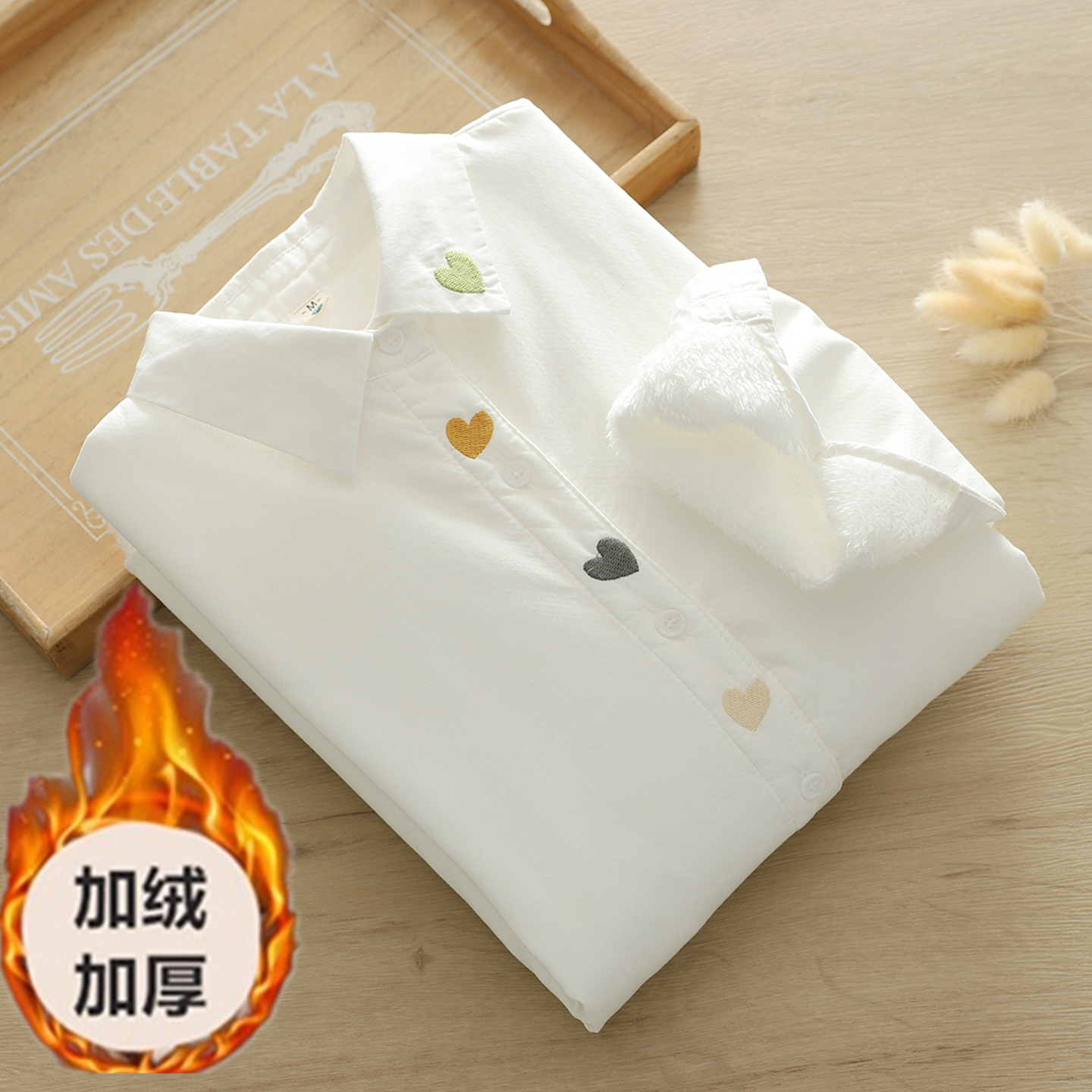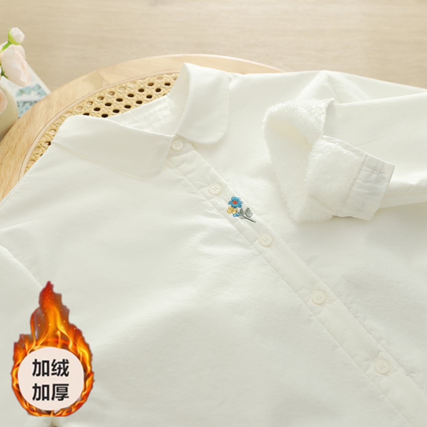 2025冬季文艺小清新刺绣花朵彩扣纯棉加绒加厚白衬衫女长袖打底衫